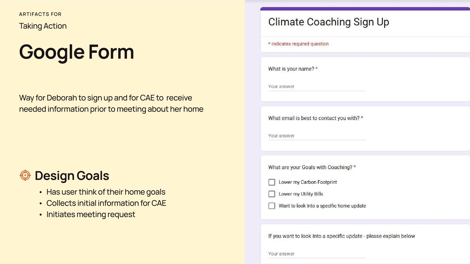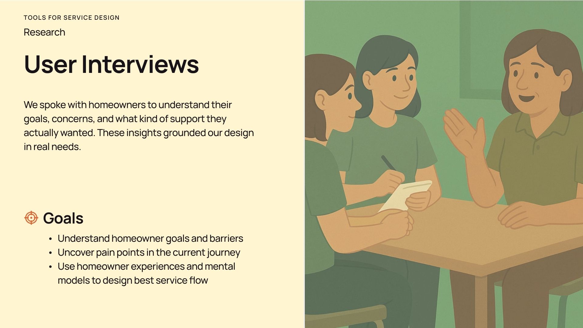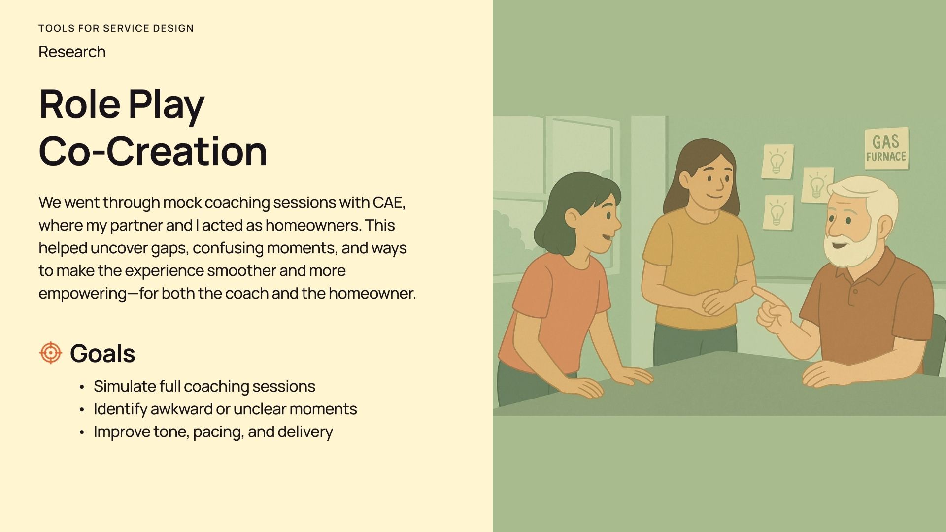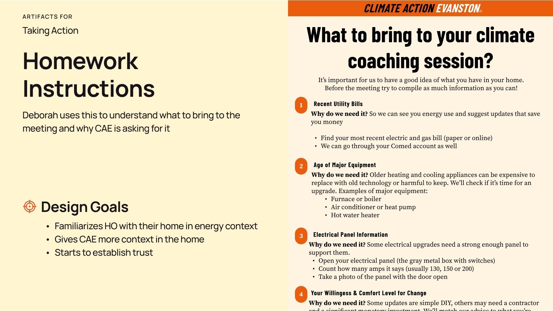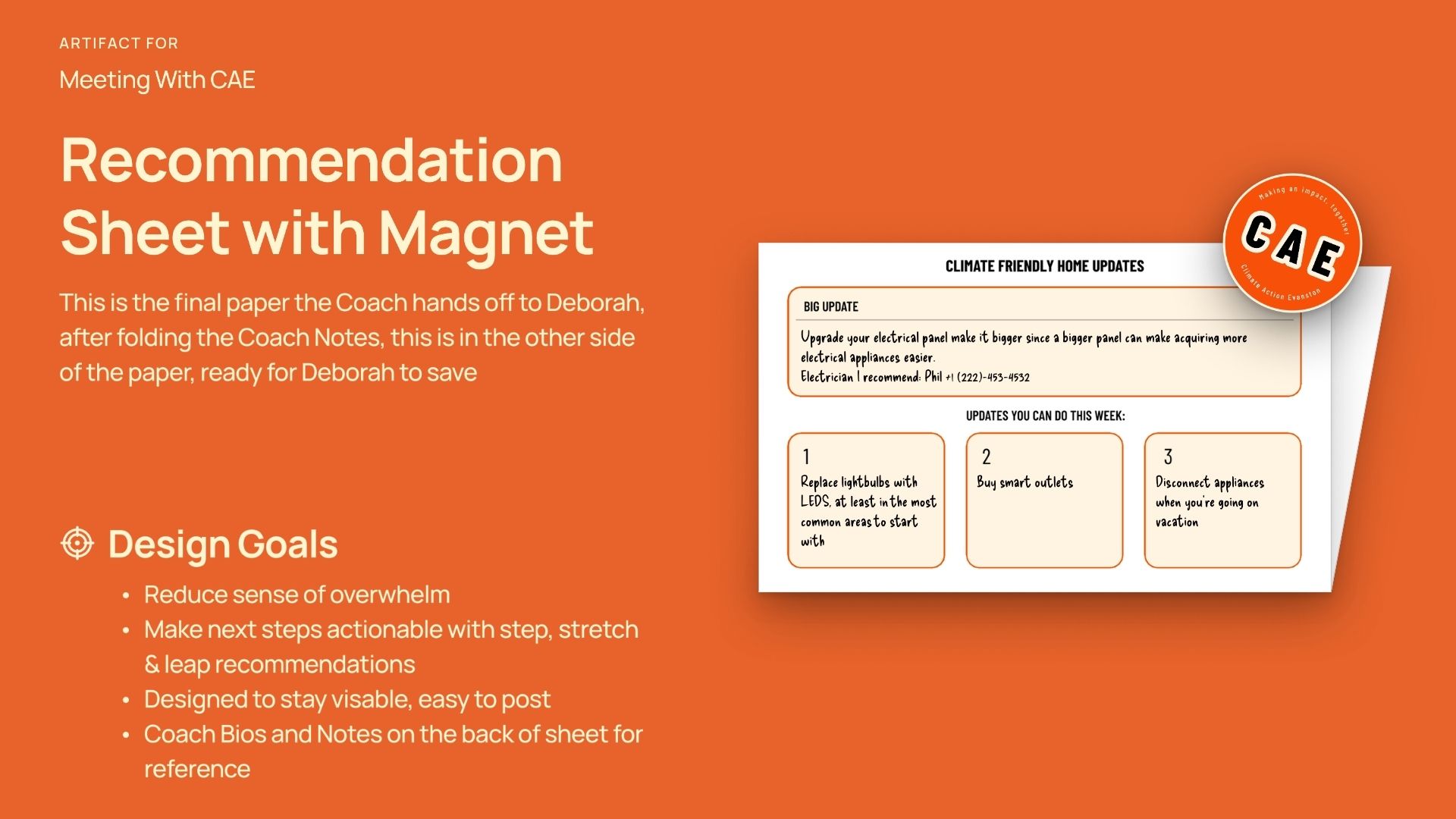 Our solution includes a suite of physical and digital artifacts designed to nudge users from awareness to action. This includes a "Big Impact" recommendation sheet designed to live on the homeowner's fridge, ensuring next steps remain visible and actionable. We also integrated a decision-tree framework to help coaches provide consistent, expert-level advice regardless of their technical background.