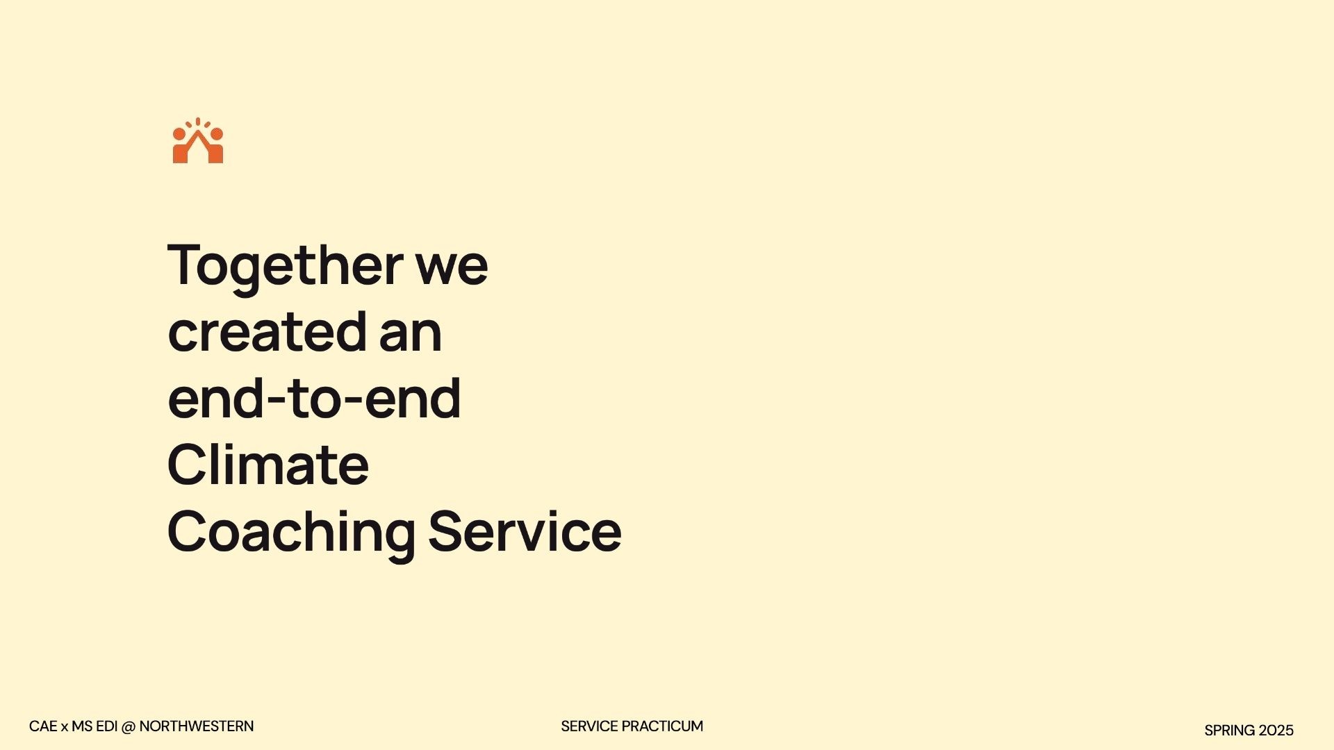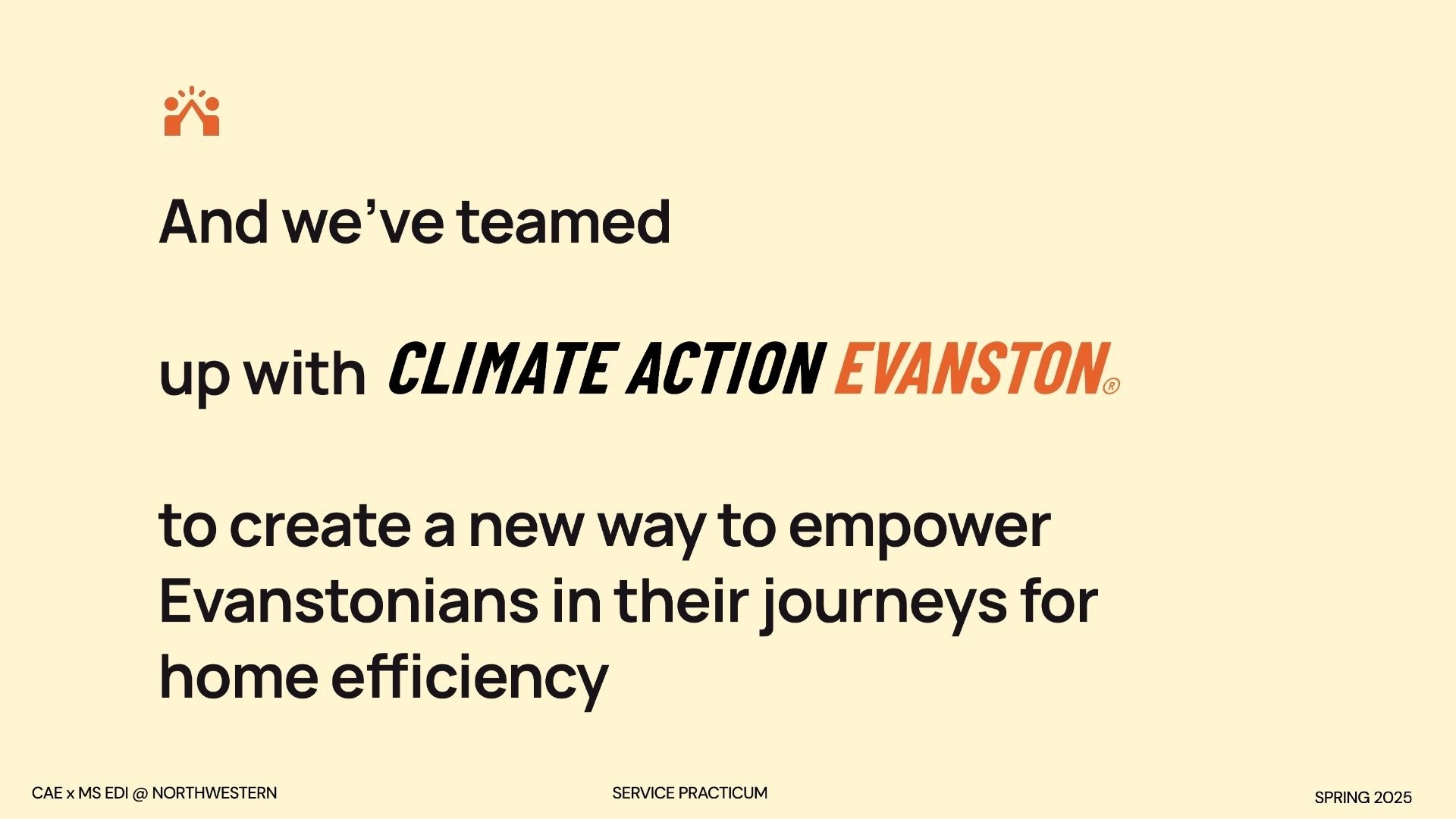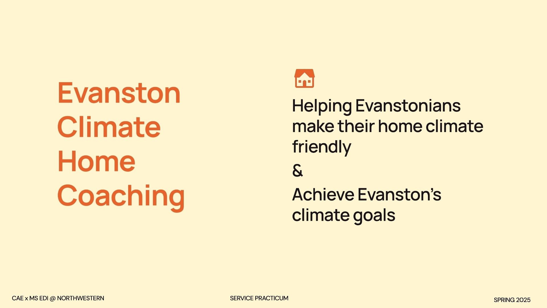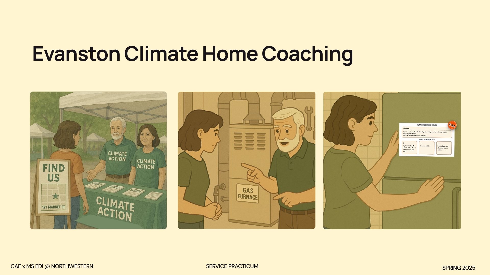 In collaboration with Climate Action Evanston (CAE), we developed an end-to-end coaching service to bridge the gap between high-level climate goals and individual household action. This project orchestrates expert architectural and engineering knowledge into an accessible, human-centered journey that empowers residents to navigate the complexities of home energy efficiency.