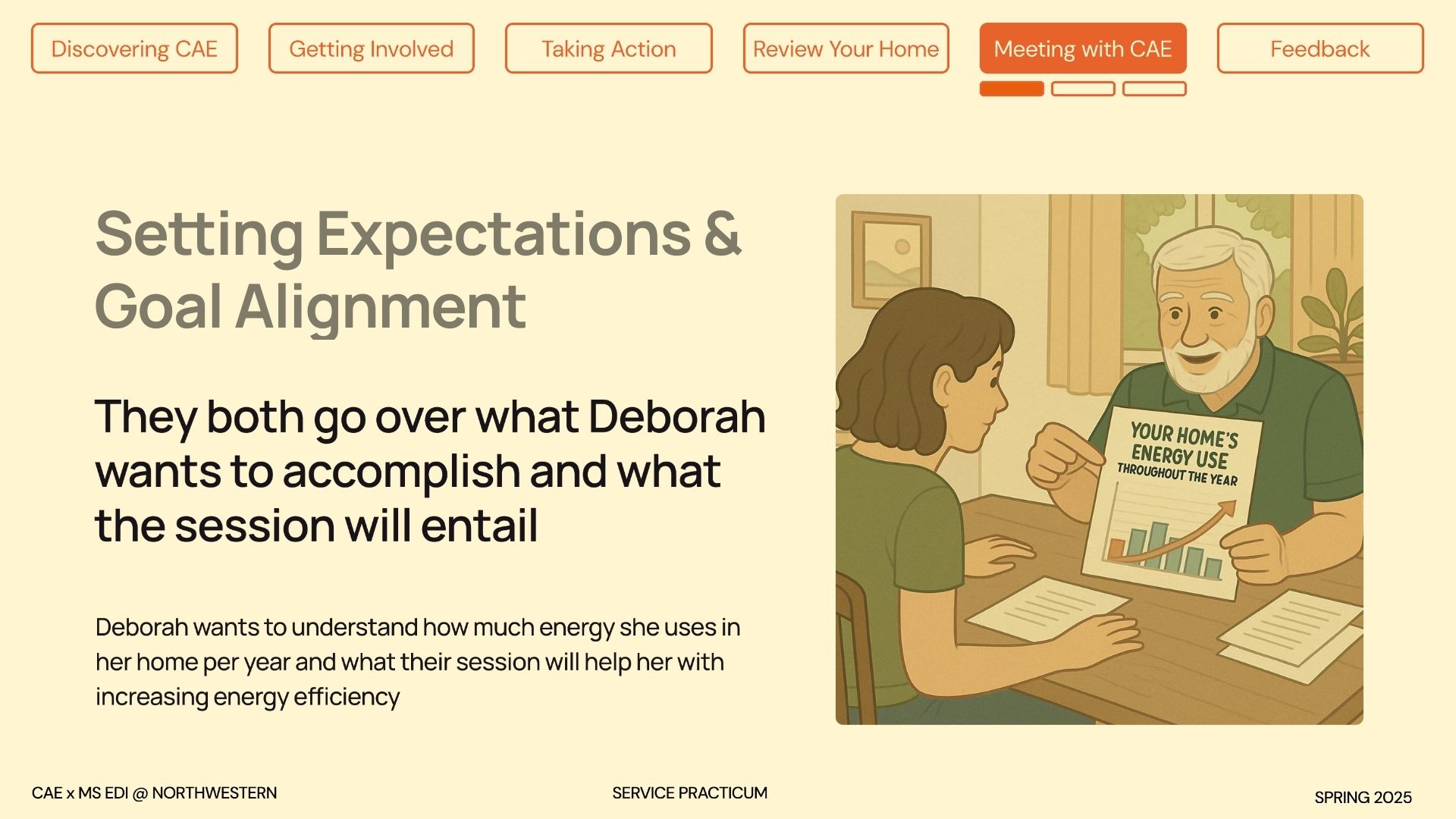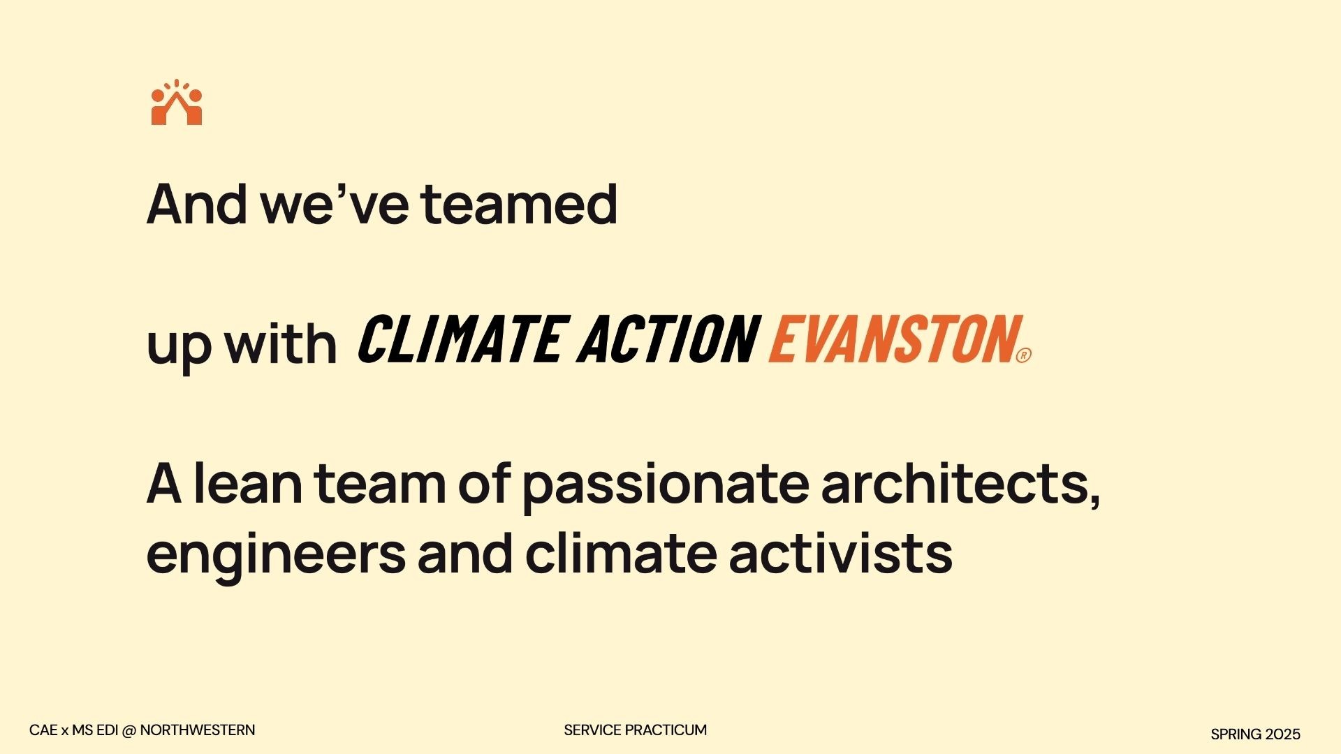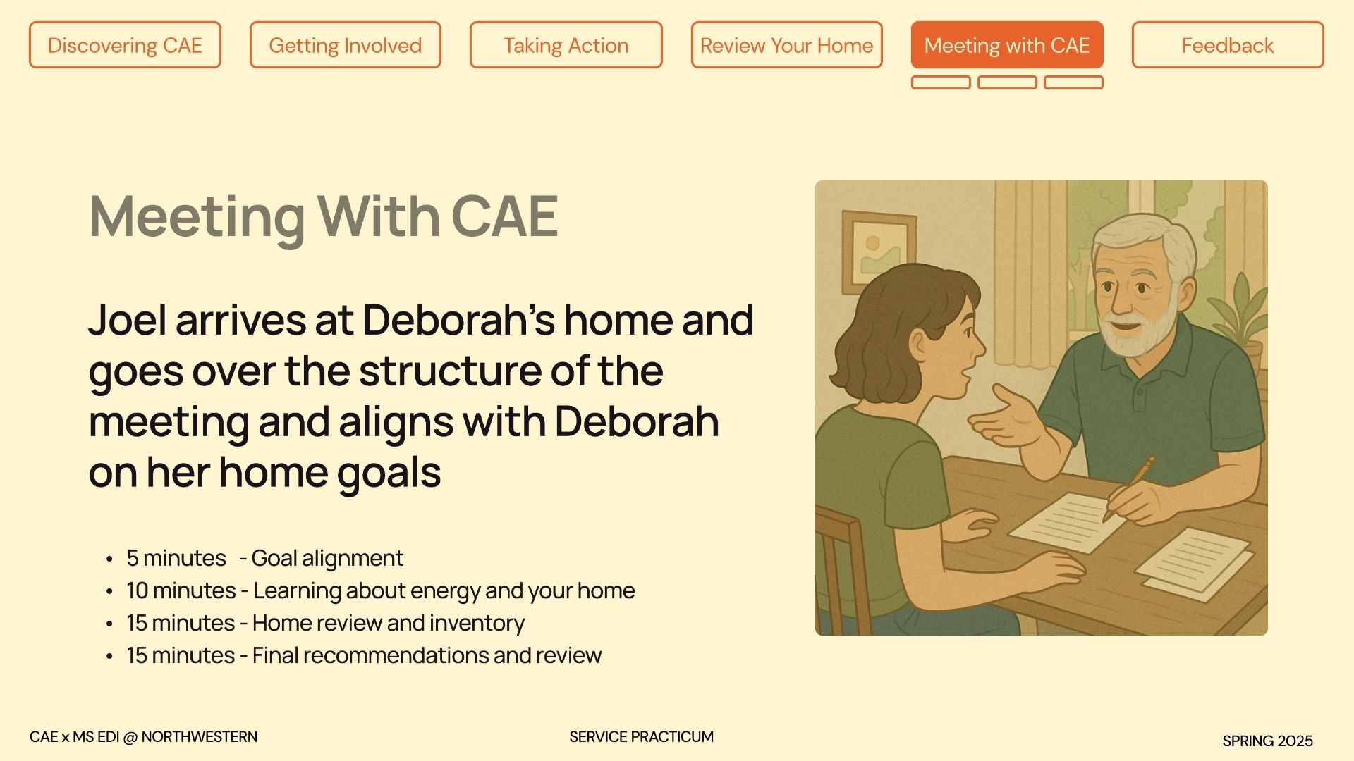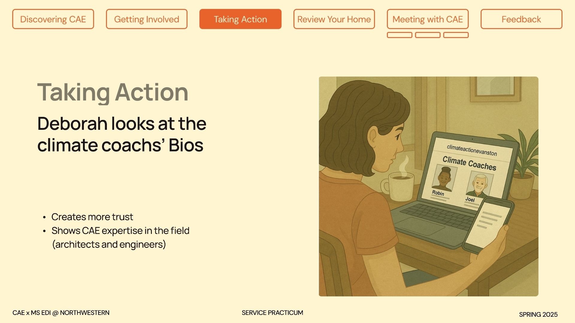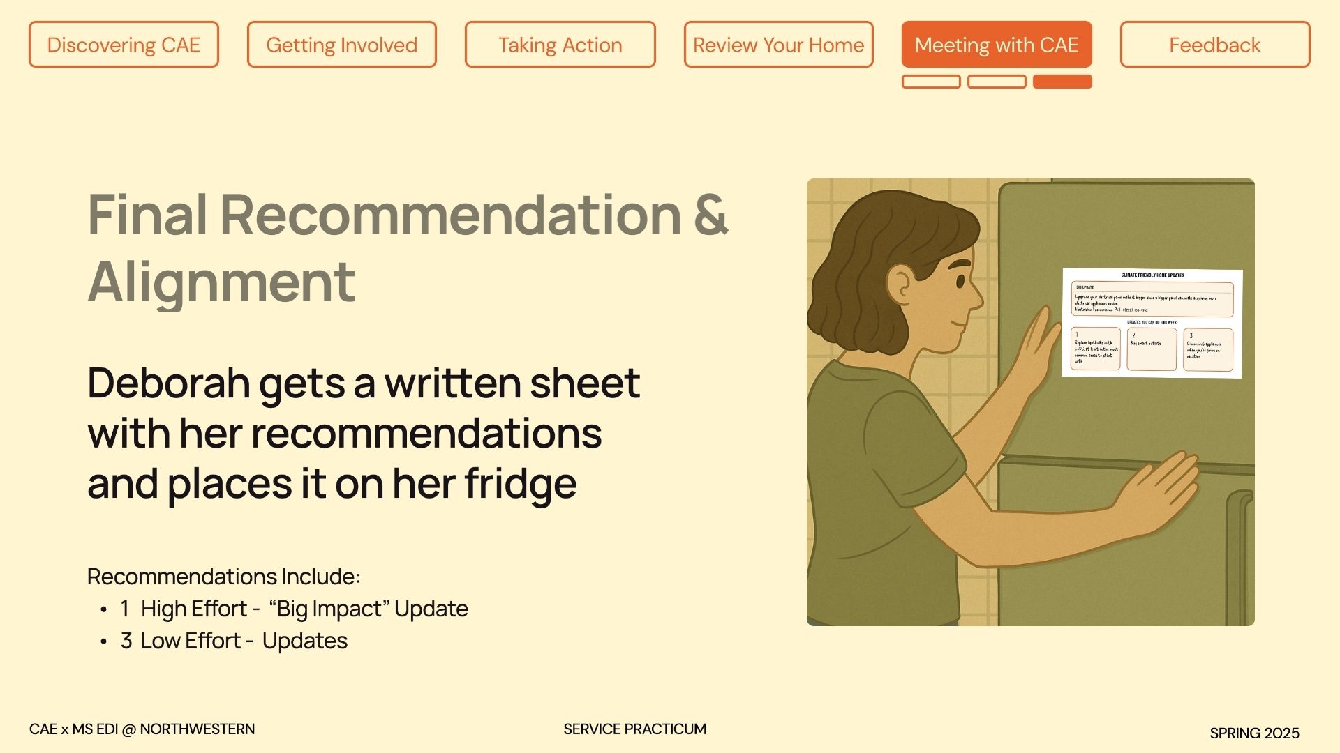 In collaboration with Climate Action Evanston (CAE), we developed an end-to-end coaching service to bridge the gap between high-level climate goals and individual household action. This project orchestrates expert architectural and engineering knowledge into an accessible, human-centered journey that empowers residents to navigate the complexities of home energy efficiency.