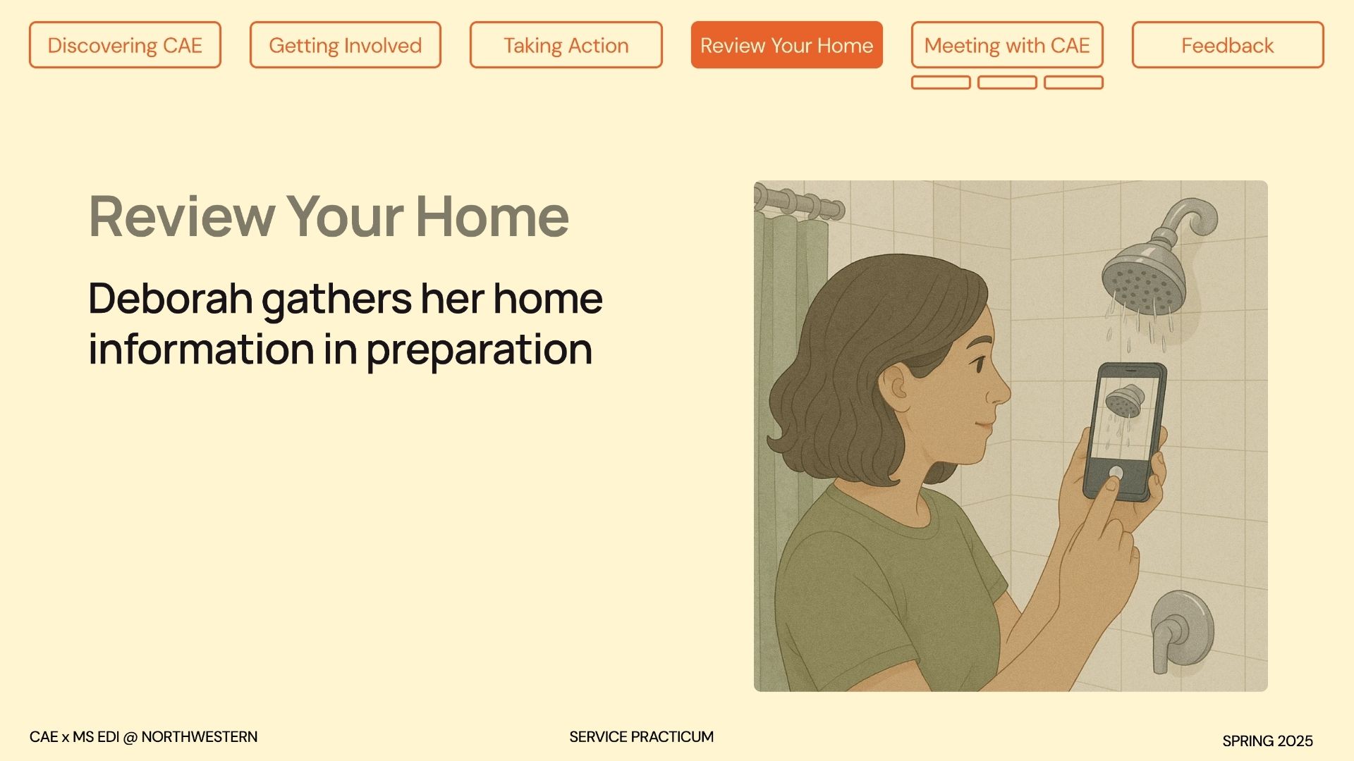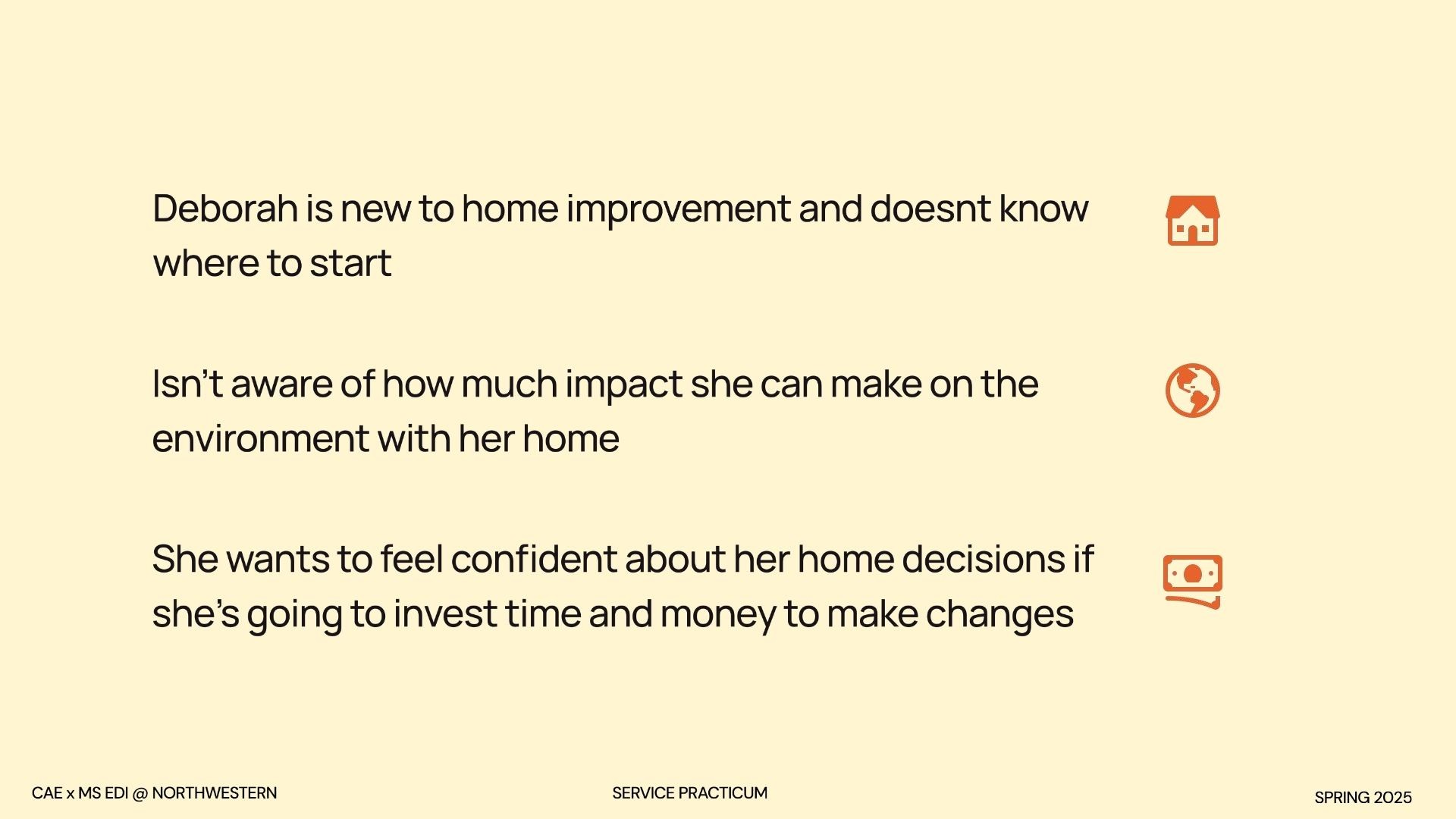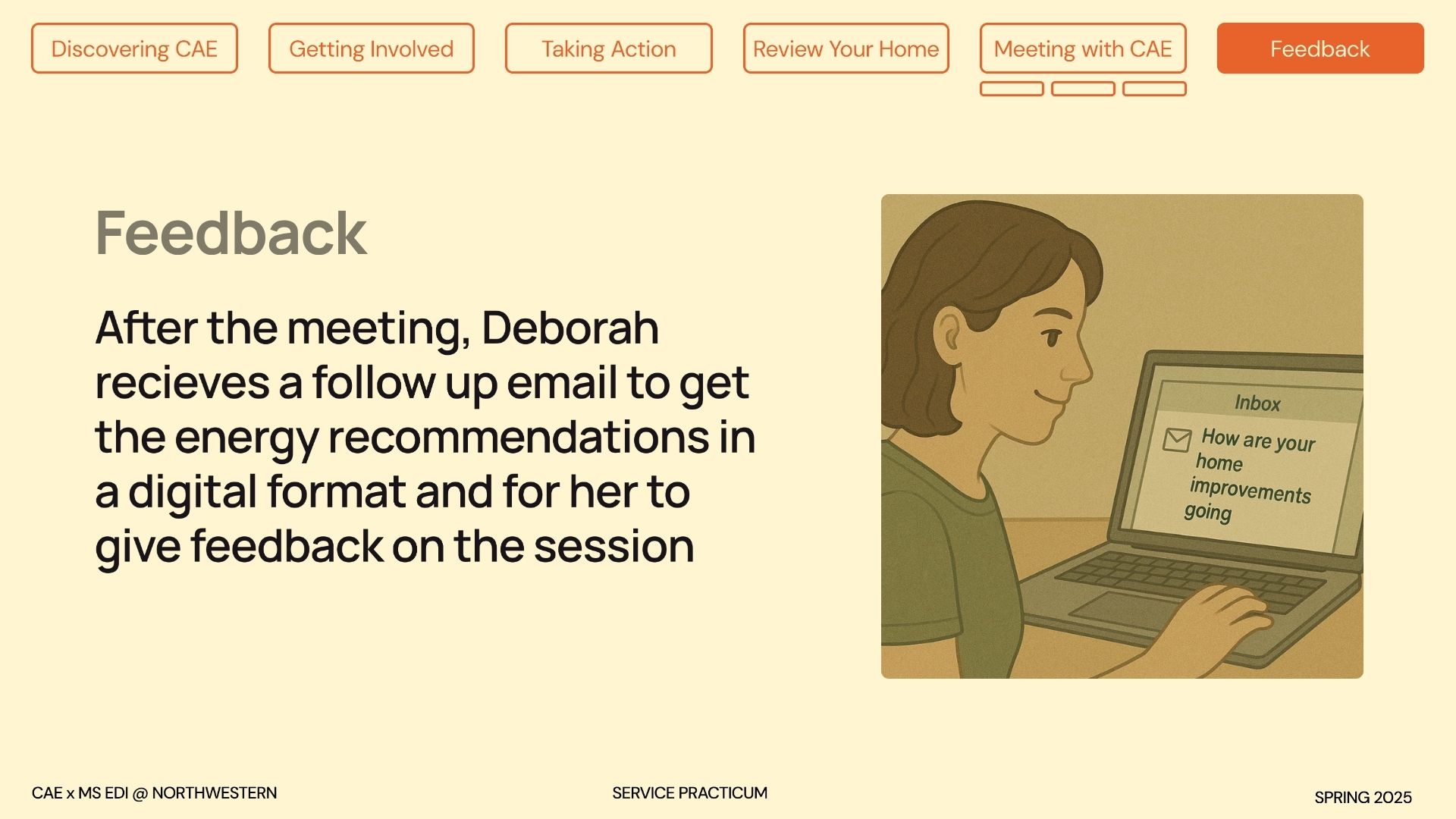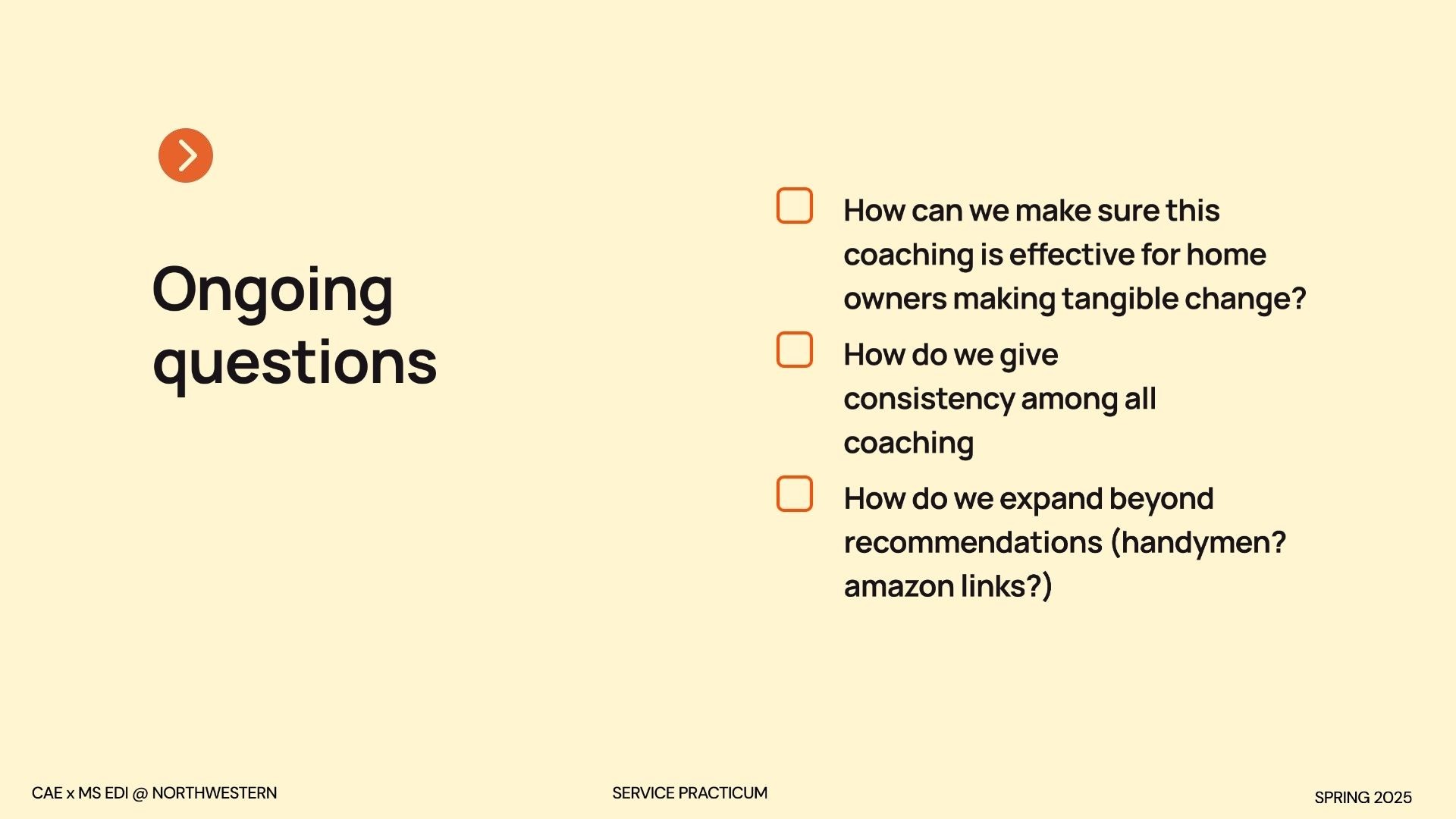 In collaboration with Climate Action Evanston (CAE), we developed an end-to-end coaching service to bridge the gap between high-level climate goals and individual household action. This project orchestrates expert architectural and engineering knowledge into an accessible, human-centered journey that empowers residents to navigate the complexities of home energy efficiency.