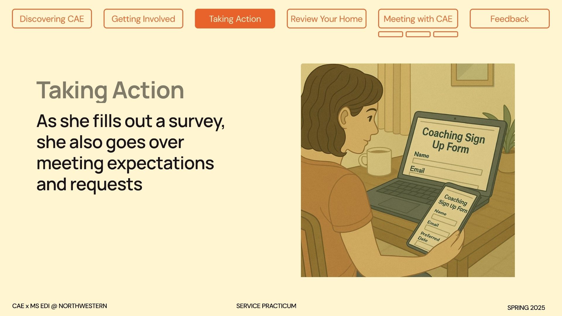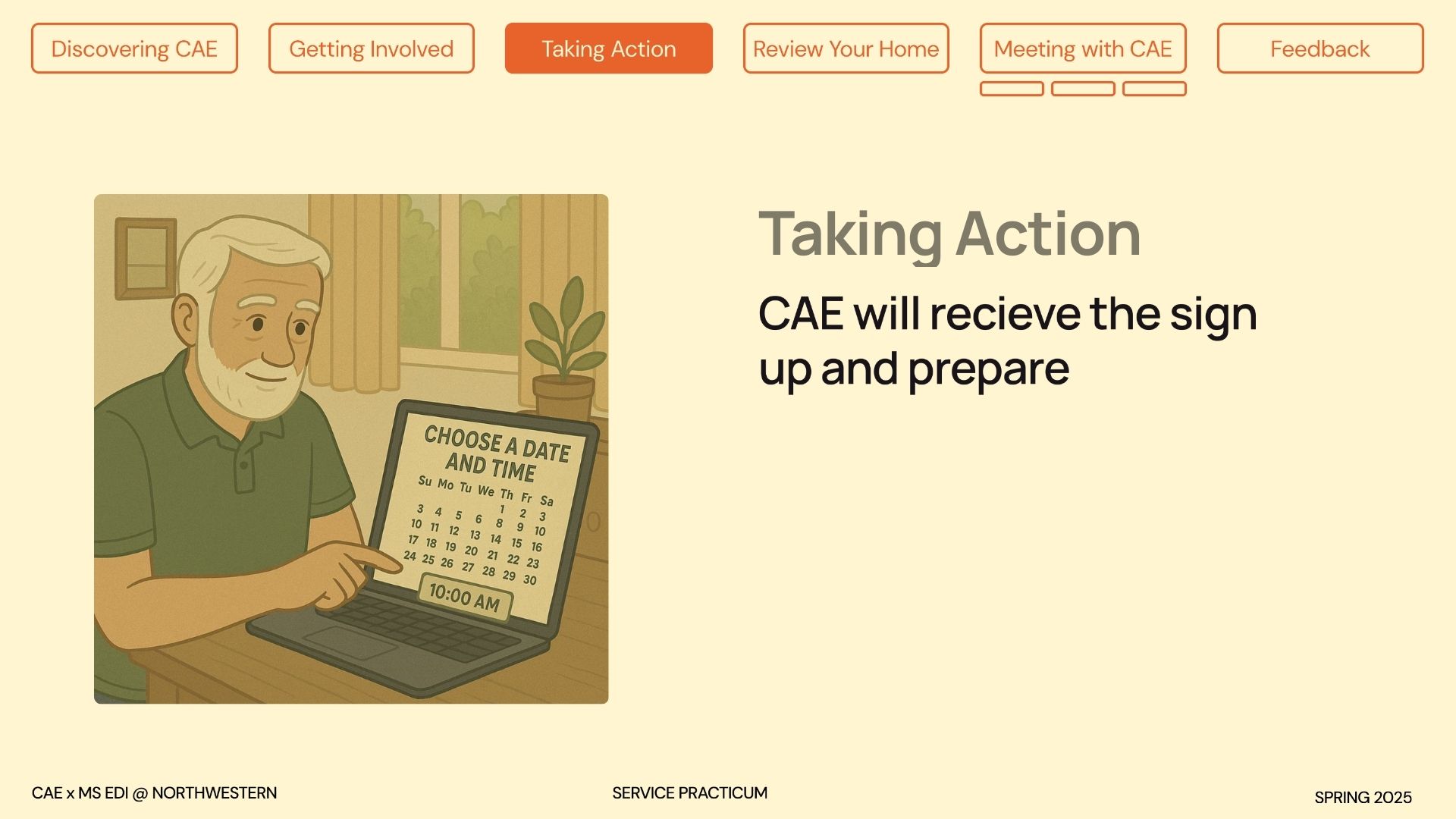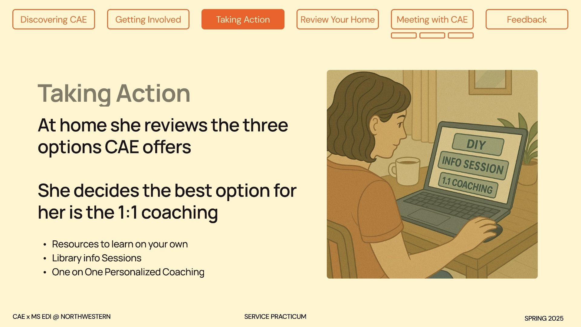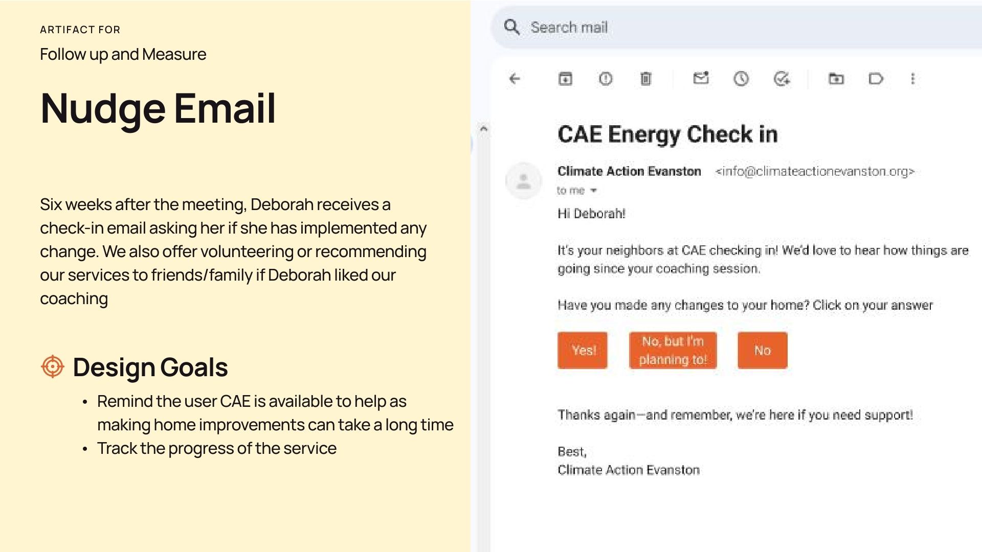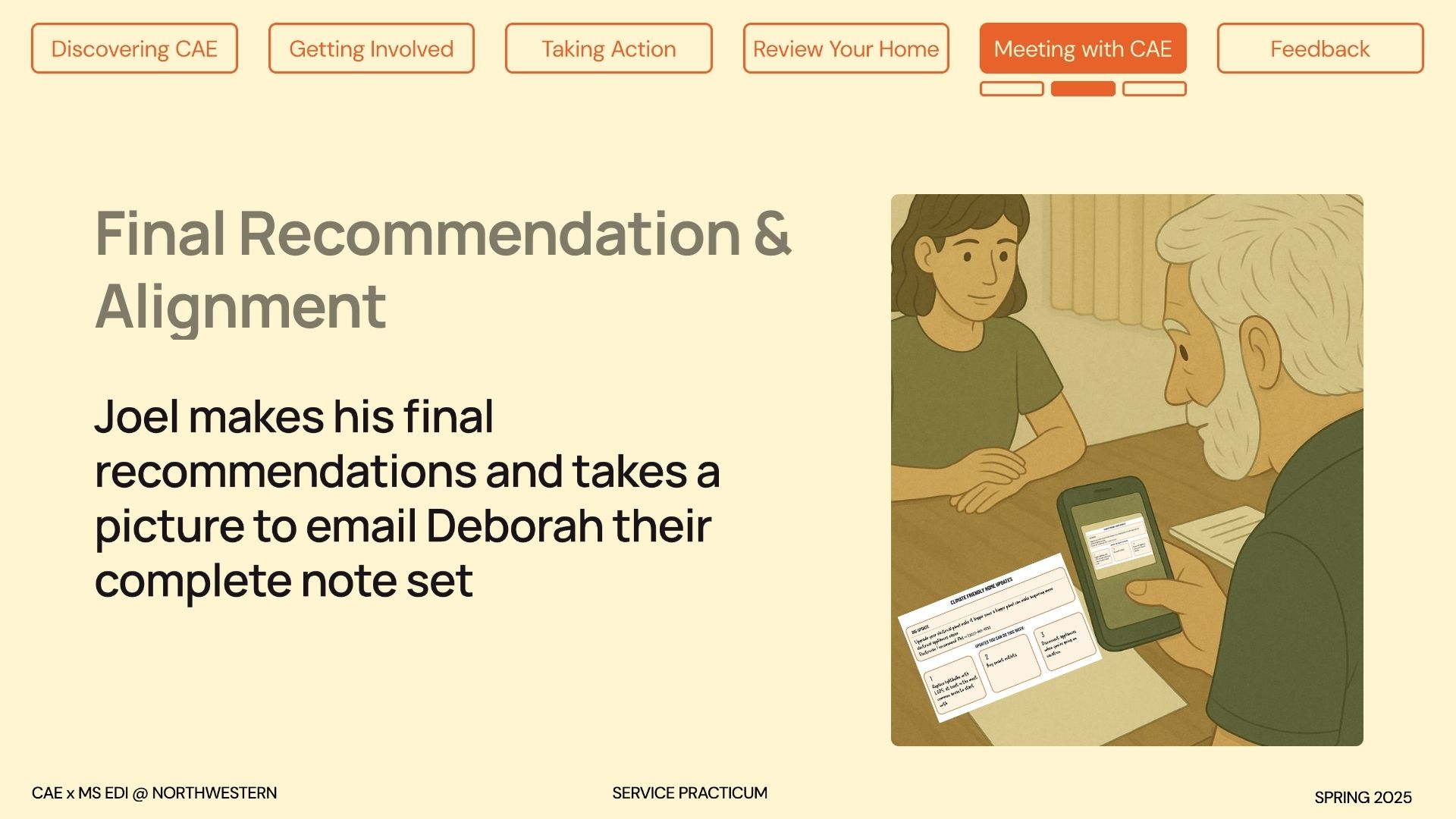 In collaboration with Climate Action Evanston (CAE), we developed an end-to-end coaching service to bridge the gap between high-level climate goals and individual household action. This project orchestrates expert architectural and engineering knowledge into an accessible, human-centered journey that empowers residents to navigate the complexities of home energy efficiency.