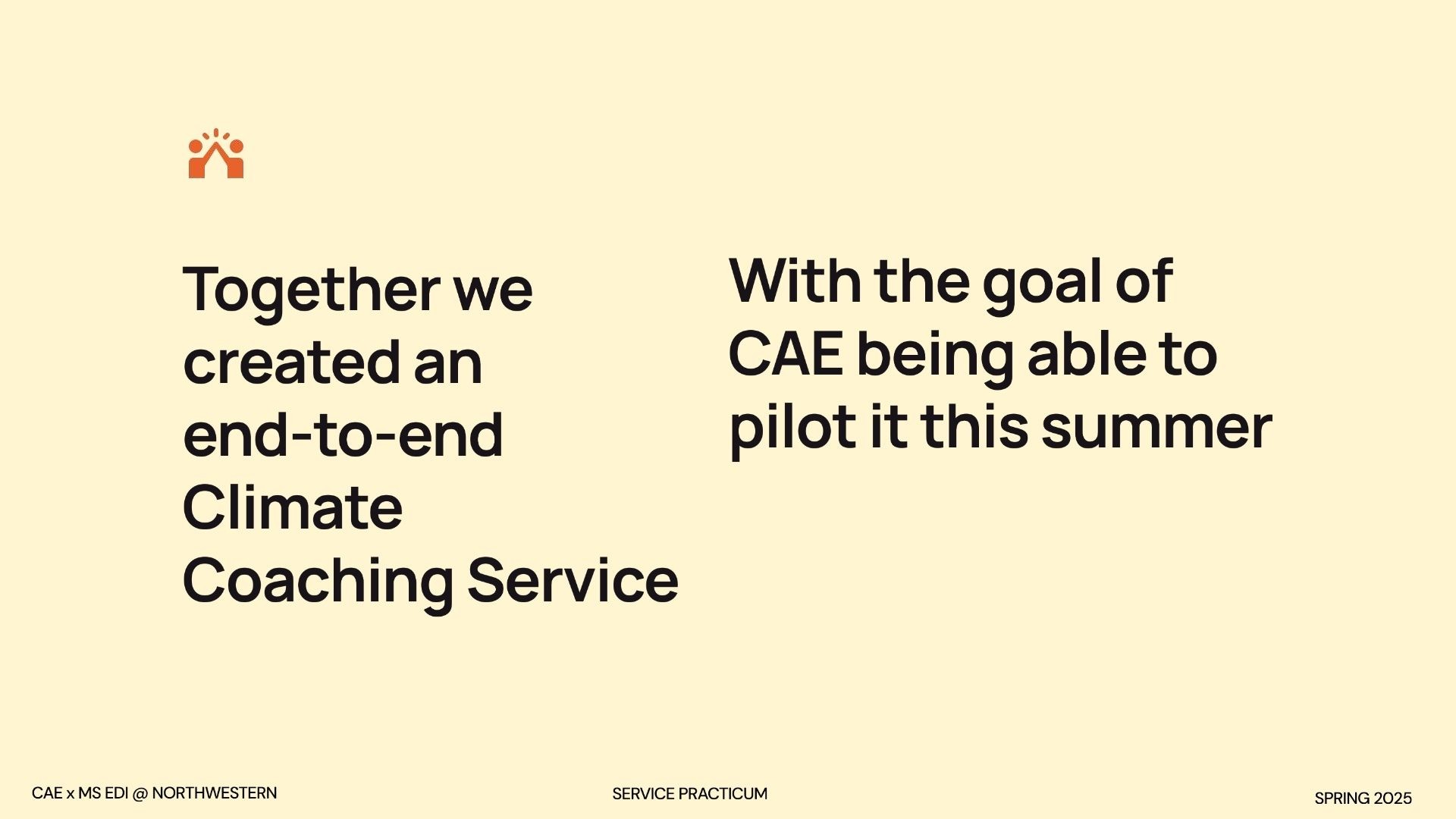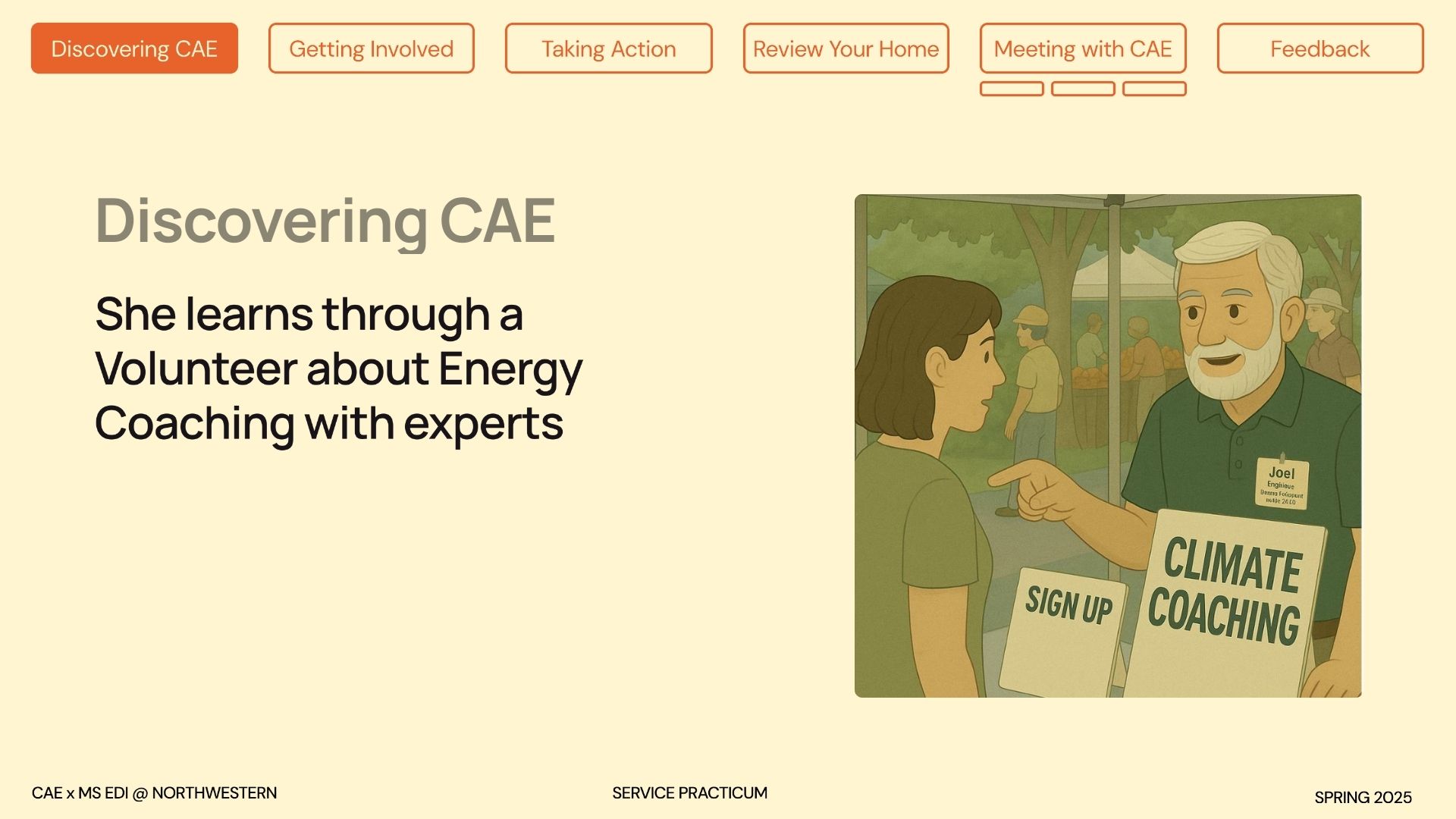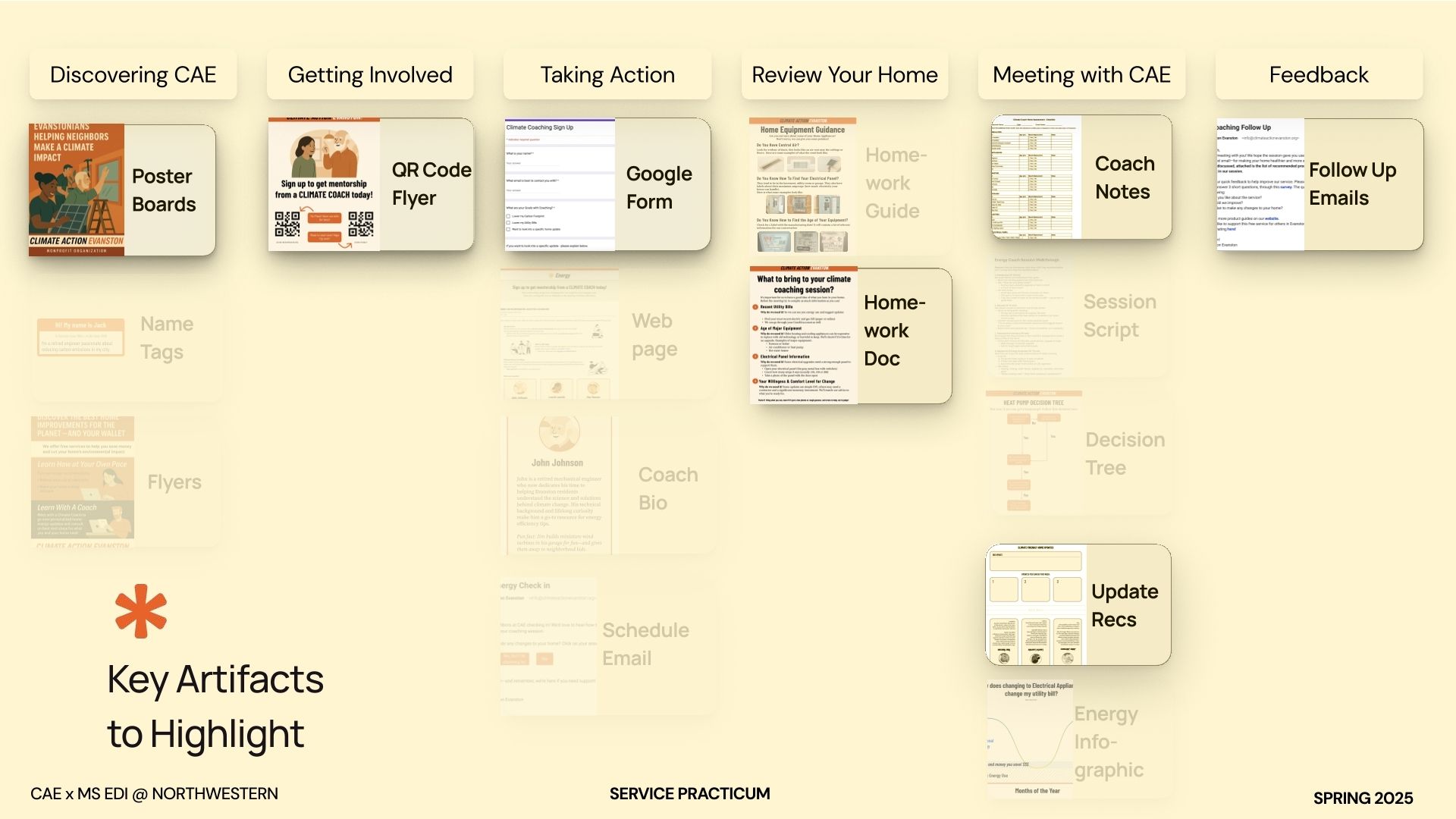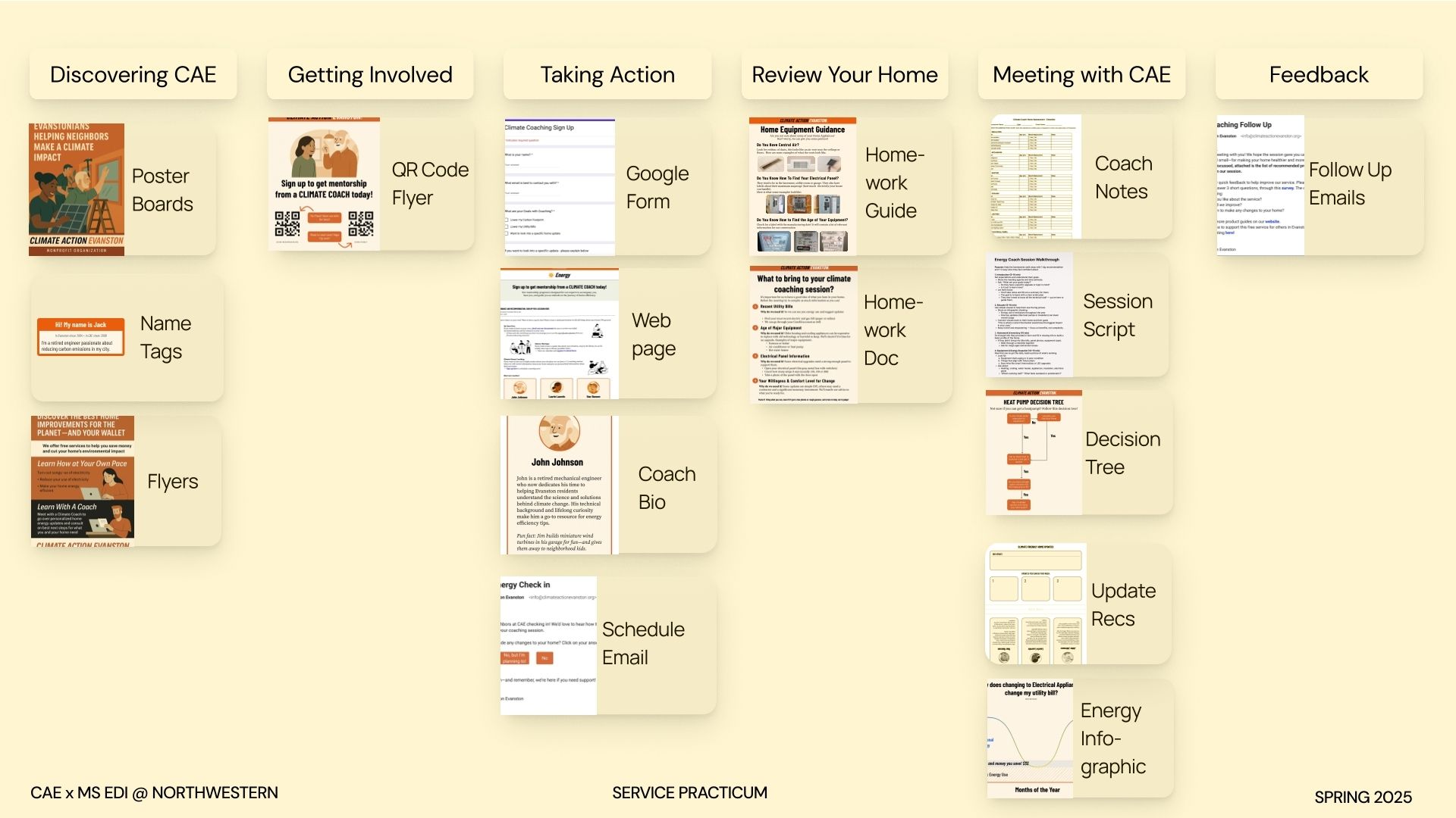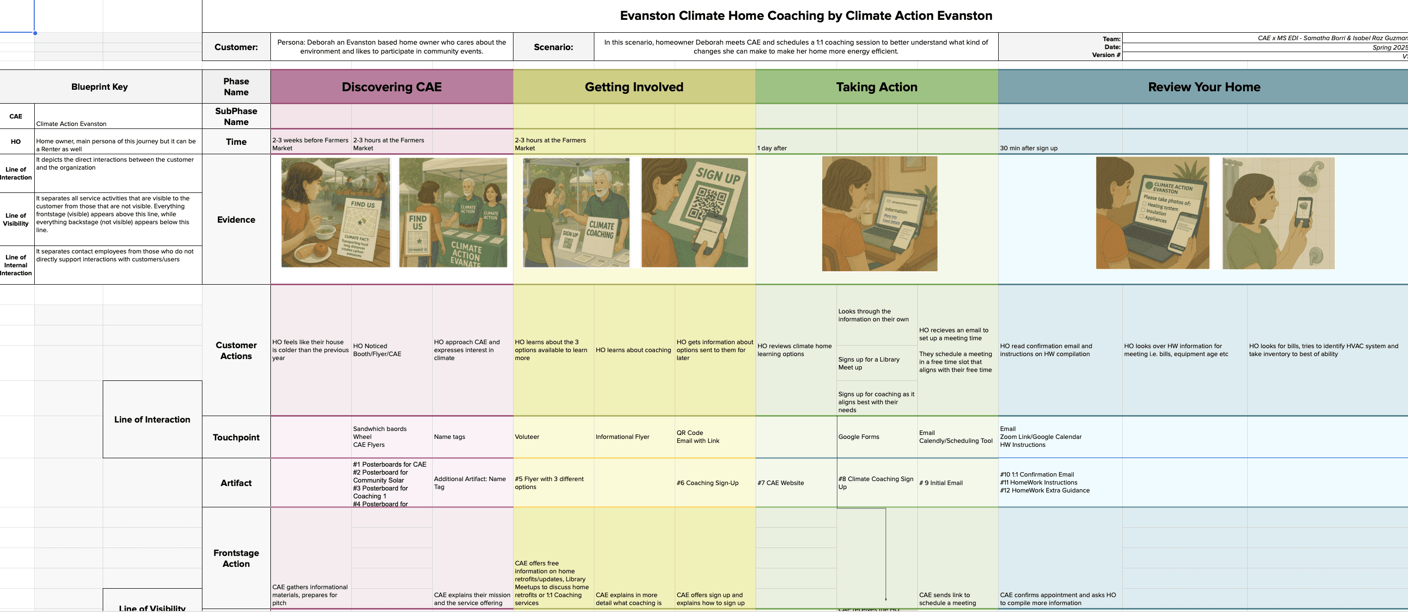 The service was designed with measurable KPIs—such as QR scan rates, session completion data, and implementation tracking—to support CAE’s future grant proposals and operational scaling. By establishing a clear training framework for volunteers, we've created a sustainable model that CAE can pilot and iterate upon to meet Evanston's 2026 climate targets.