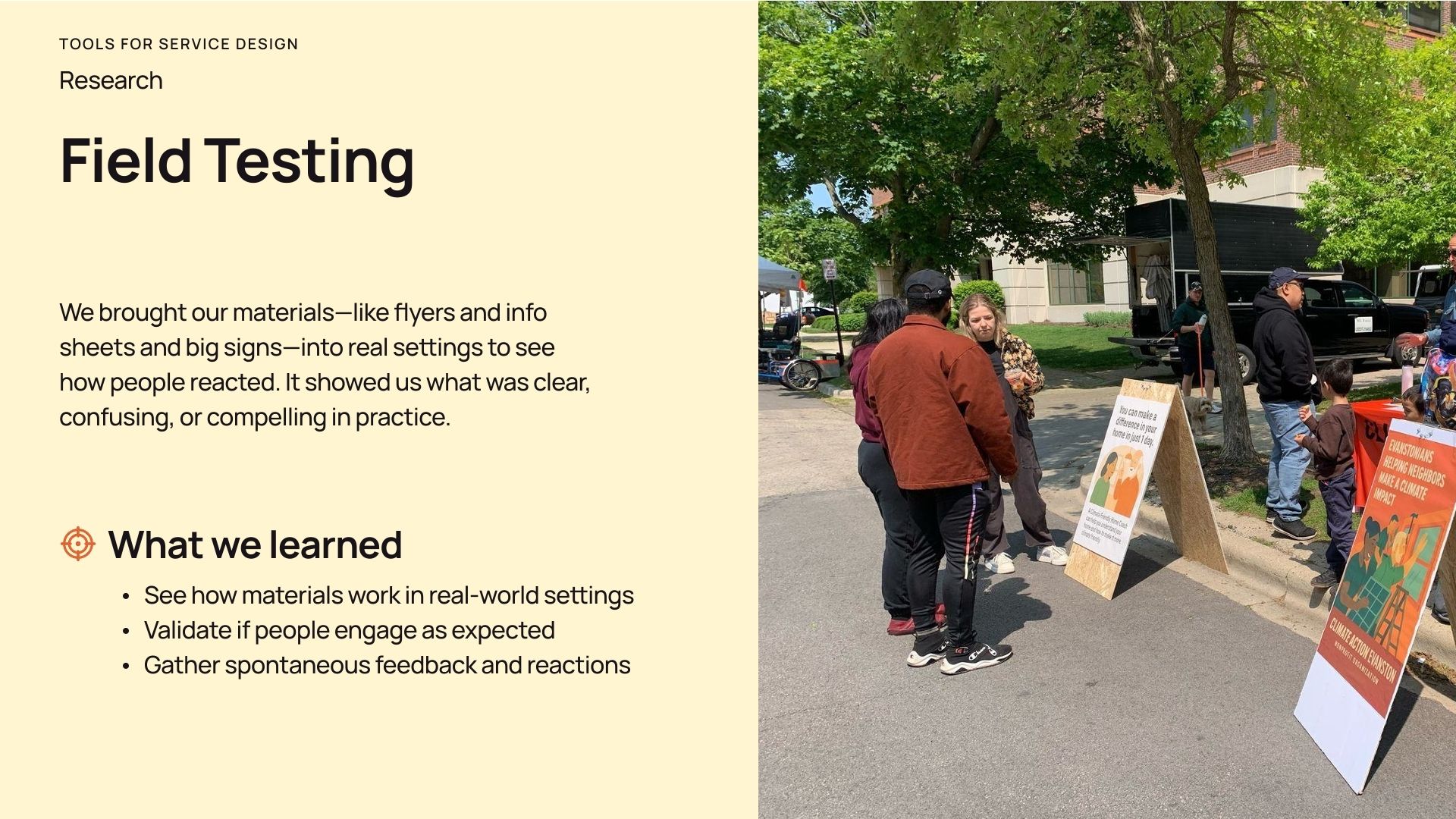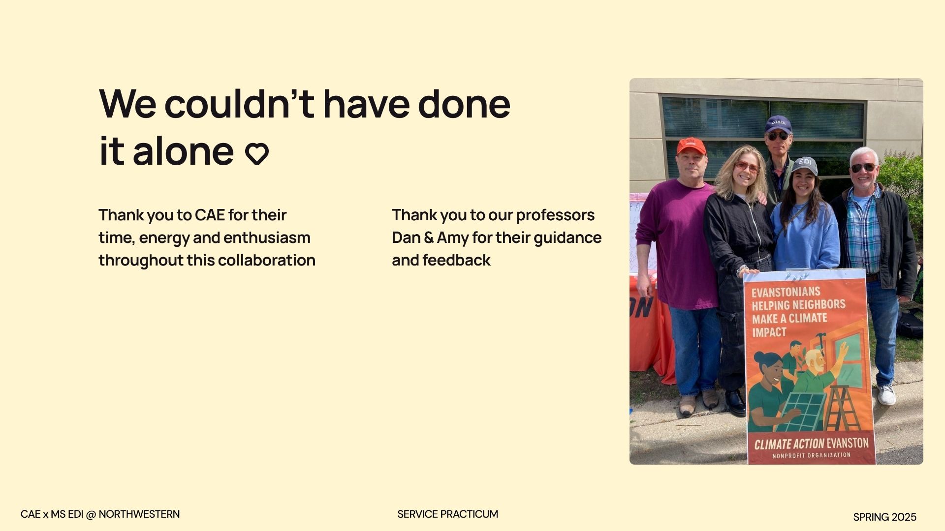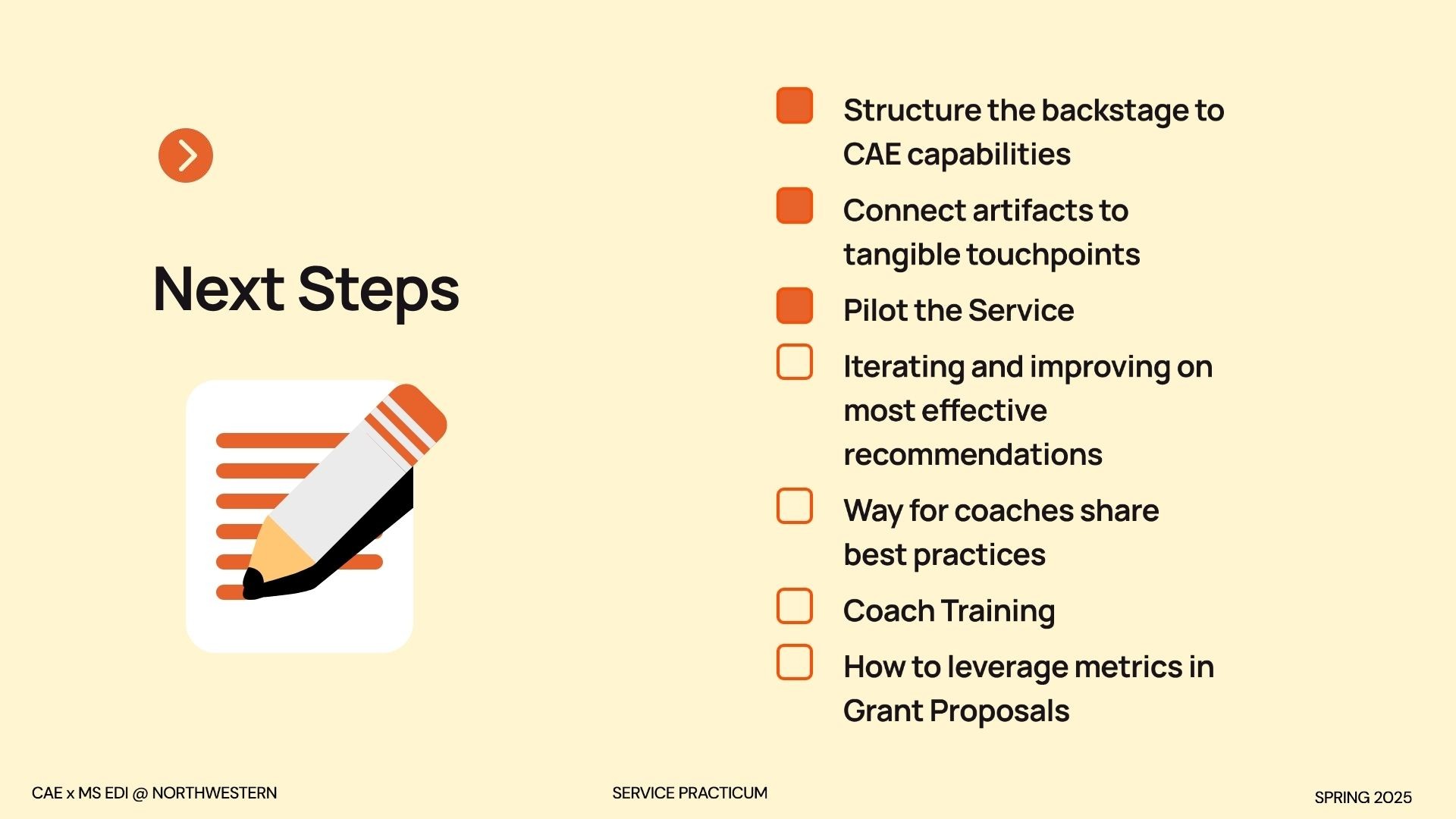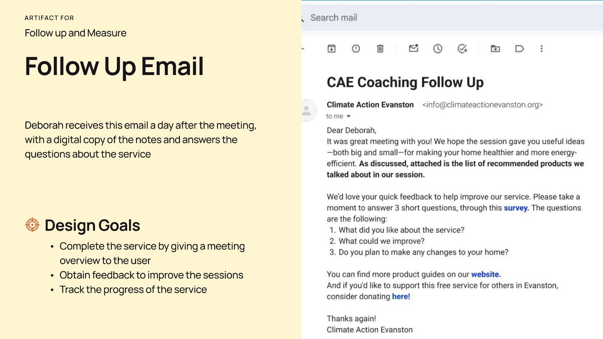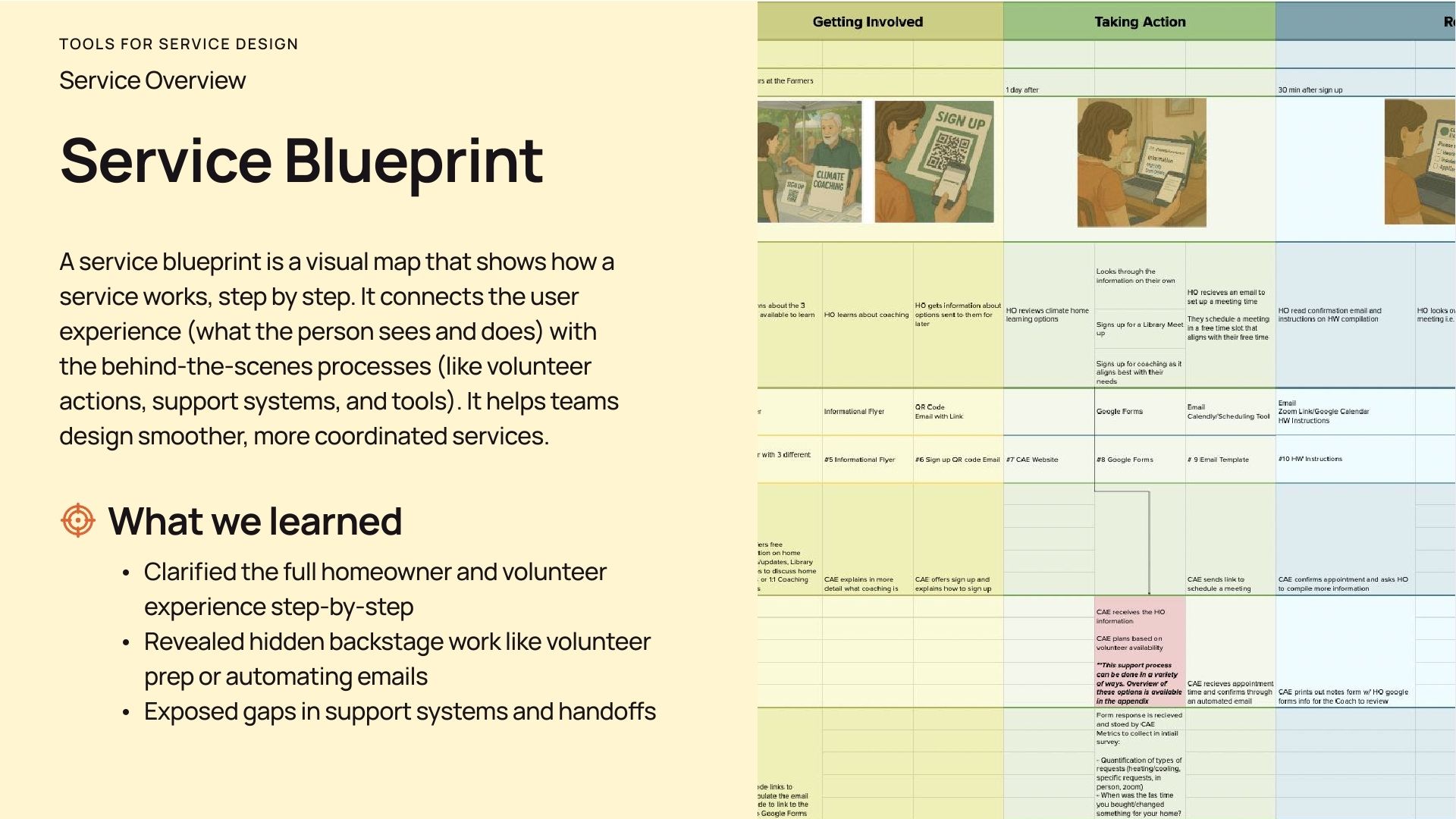The service was designed with measurable KPIs—such as QR scan rates, session completion data, and implementation tracking—to support CAE’s future grant proposals and operational scaling. By establishing a clear training framework for volunteers, we've created a sustainable model that CAE can pilot and iterate upon to meet Evanston's 2026 climate targets.